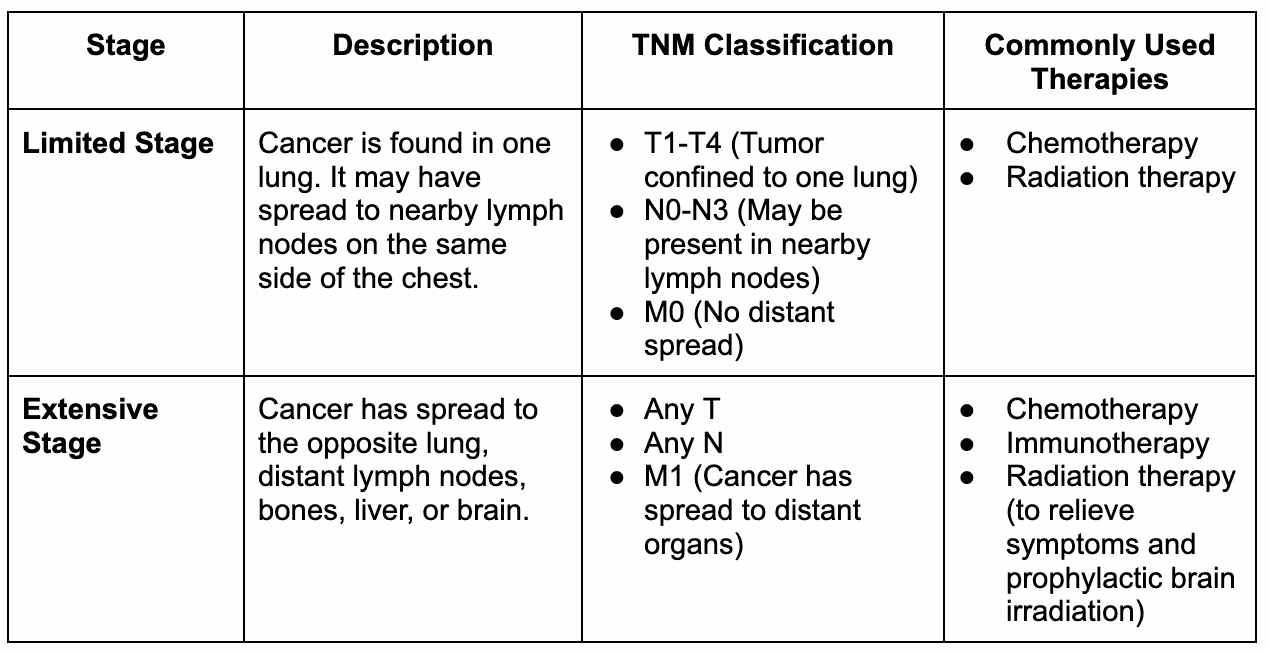 SCLC is staged using two systems to help doctors understand how far the cancer has spread and what treatments are best.