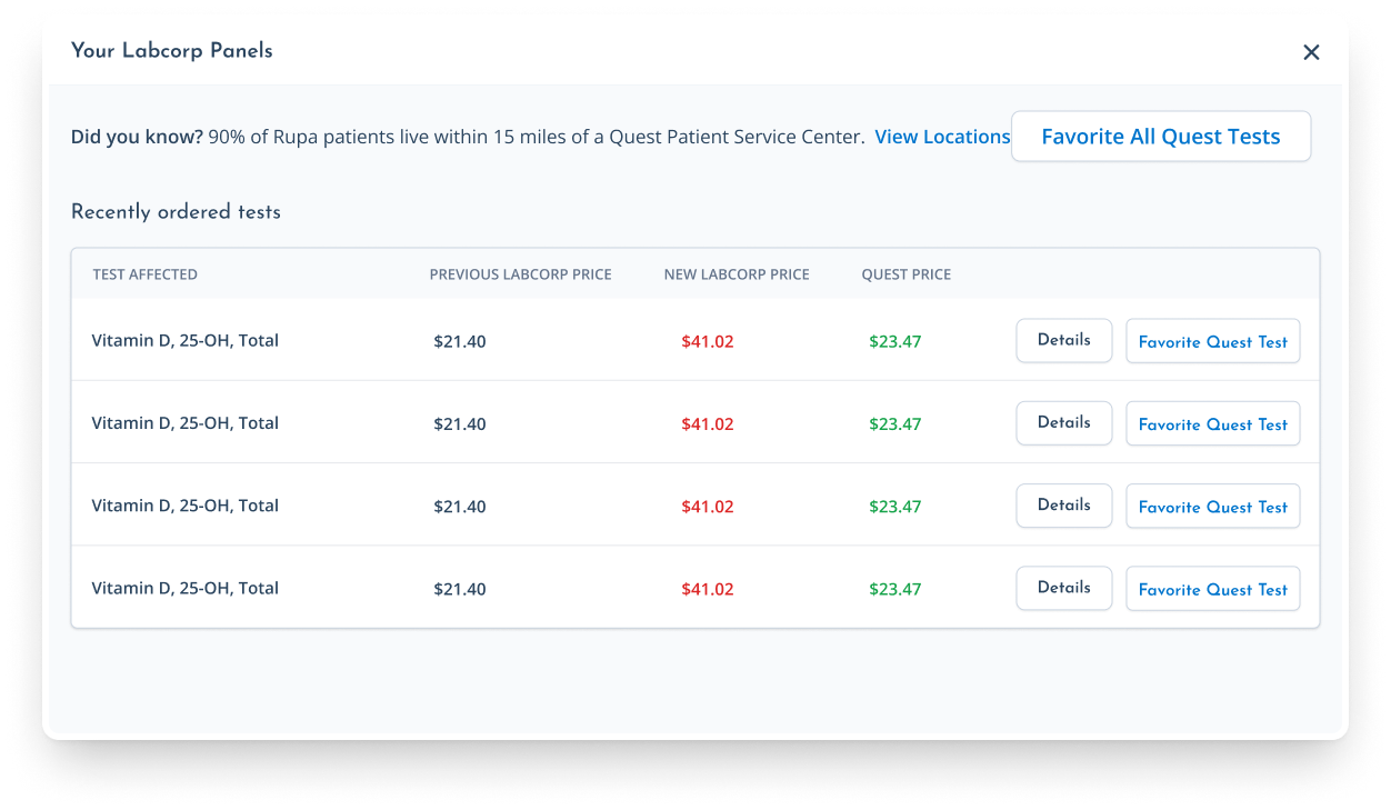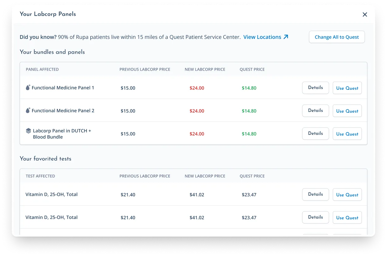 And when you're ready to switch, Rupa makes it easy — you can swap Access Labcorp panels for equivalent Quest options with just a click.