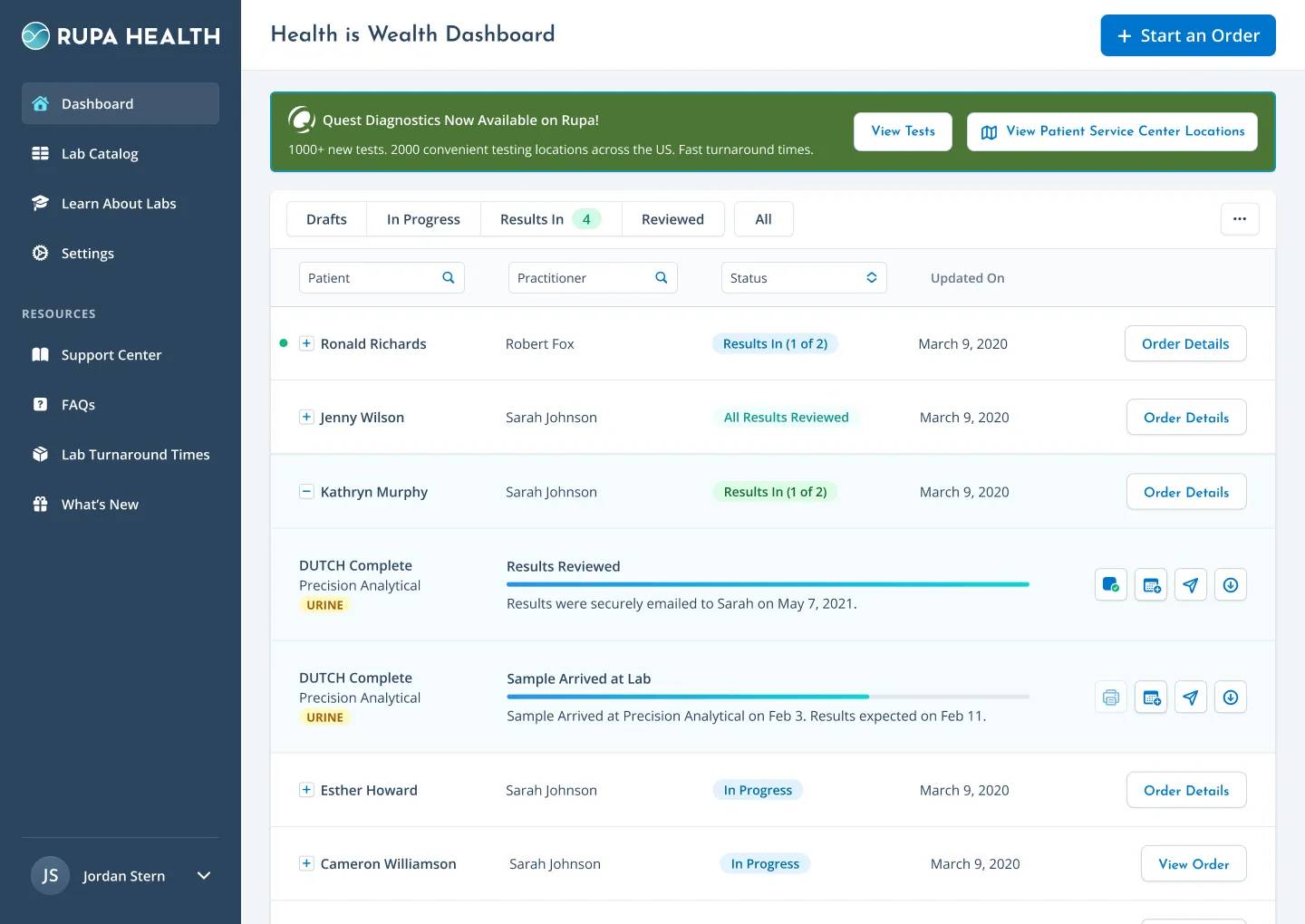 All Quest orders placed through Rupa flow directly into your Rupa provider dashboard, not your pre-existing lab account, just like all other labs ordered on the platform. This keeps every result in one centralized view without any extra logins.